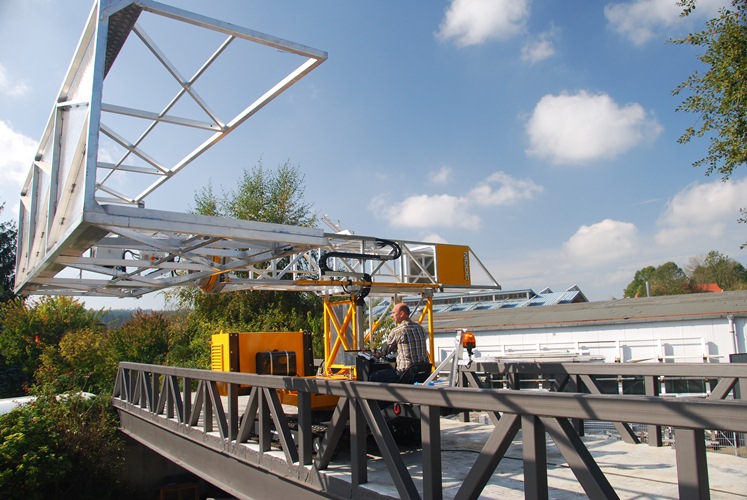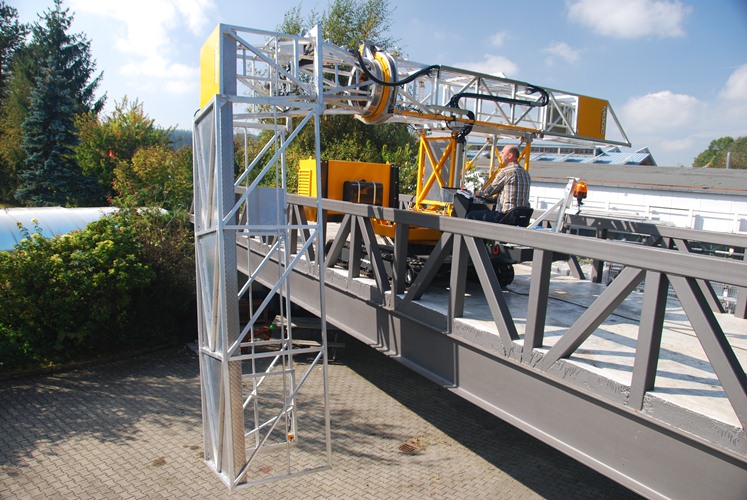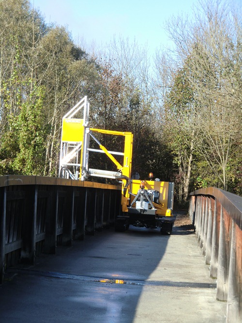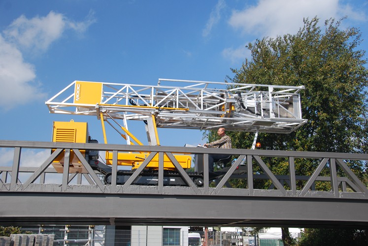 A small Bridge Inspection Unit was crawler-mounted with a low payload. It was a conceptual design for operations on a narrow sidewalk, cycle-way bridges, or sidewalks with low load capacity restrictions. Space required on the bridge is only 1.6 m and a maximum point load of 70 kN/m² this unit is “underbidding” all comparable units on the market.