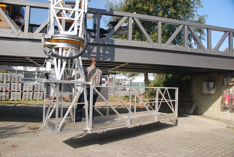 The upper structure is also designed with compactness as another plus to the unit: In transport position the working platform is stored smartly around the tower to keep the width down to 1.6 m. Most requirements for low capacity bridges are met sufficiently with a horizontal working range of 5 m under the bridge, a 300 kg working load on the platform and a lowering depth of 4 m during operation.An additional portable scaffold completes the overall scope of the equipment: Different installation variations allow the platform to be rotated under narrow bridges too.A 12 kVA diesel generator provides the necessary power for the electric pump and the electrical sockets located on the platform.