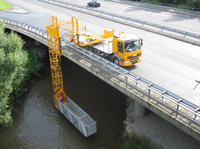 With a max. horizontal range of 13 m under the bridge and a max. over-bridging of sidewalks of 3.3 m, this unit is uniquely constructed for city bridges.
