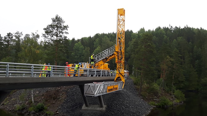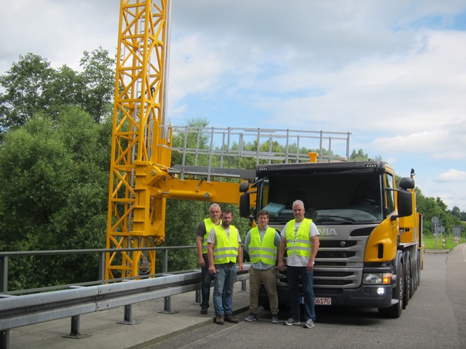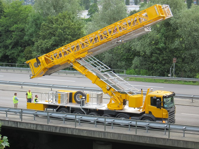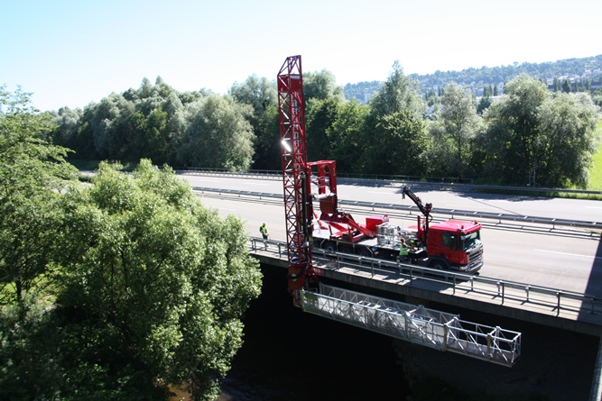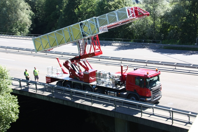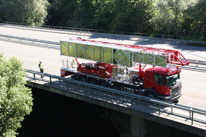 The result is an impressive: 18.0 m of horizontal working range under the bridge with either 3.9 m of sidewalk clearance or 4.0 m crossing of sound barriers and 9.7 m of maximum lowering depth. All this with a total weight of only 32 tons.