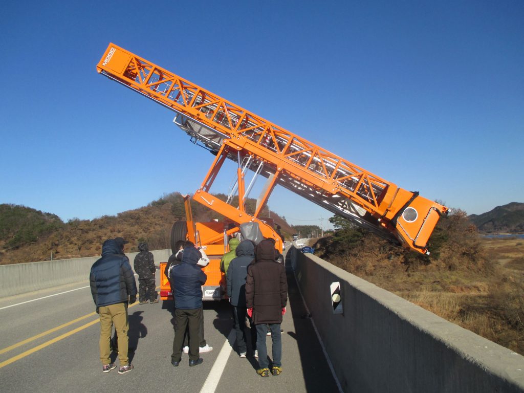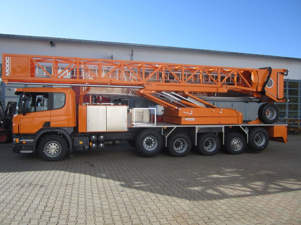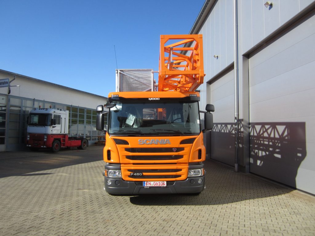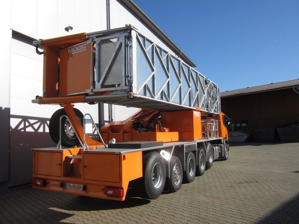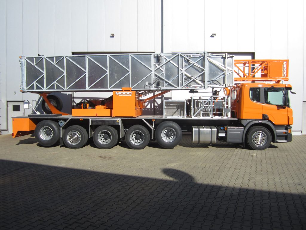The platform unit was mounted on a SCANIA chassis, has a standard horizontal reach of up to 20.0 m under the bridge and a platform width of 1.5 m. The platform can be loaded with up to 6 people plus 320 kg of material at the same time (max. 800 kg).