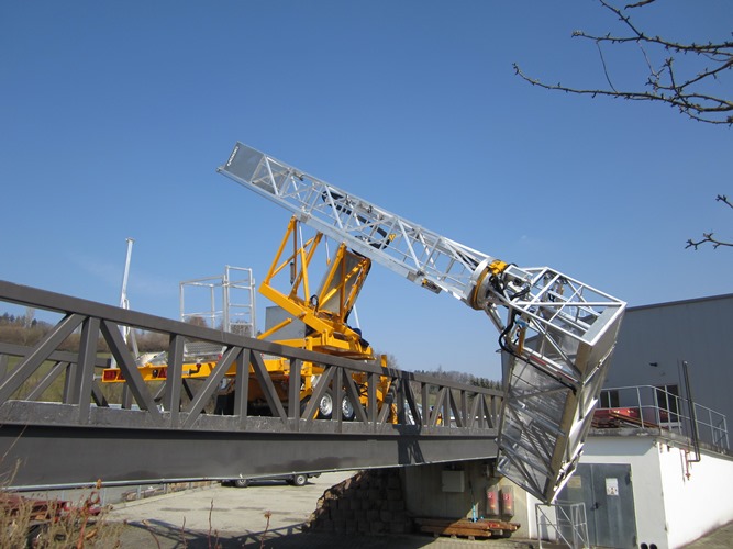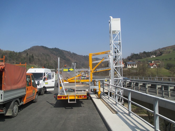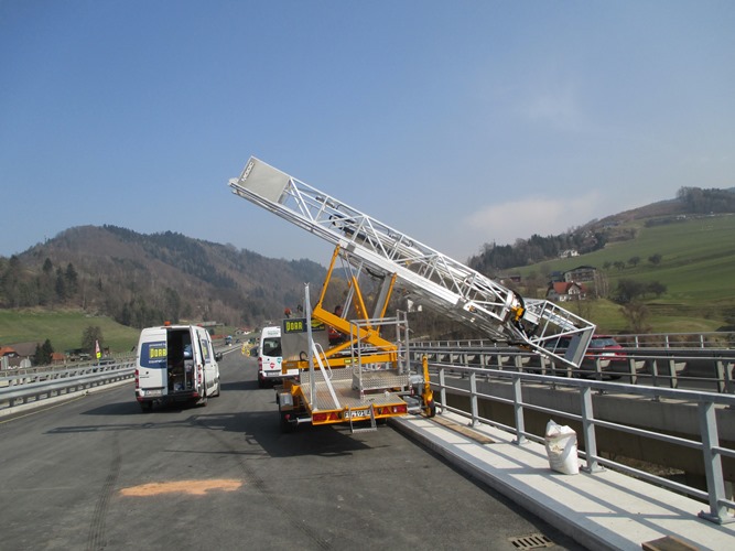 At the customer’s request, both machines were additionally equipped with the special erection function (excavator erection), which enables erection of the unit between e.g. catenaries in railway areas or on truss bridges. The platform can be rotated 90 ° before setting up the tower and can then be placed into the bridge’s upper structure prior to being lowered down. The scaffoldings, which were also supplied, complete the equipment giving it the possibility to access deep girders from the platform deck.