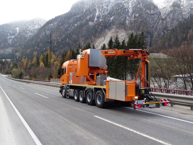 The MBL 1600 was mounted on a SCANIA truck chassis and has a maximum horizontal range of 16.0 m under the bridge. To enable the operation of the unit even over wide sidewalks, the under-bridge unit is equipped with a telescopic boom that reaches over a maximum of 4.8 m.